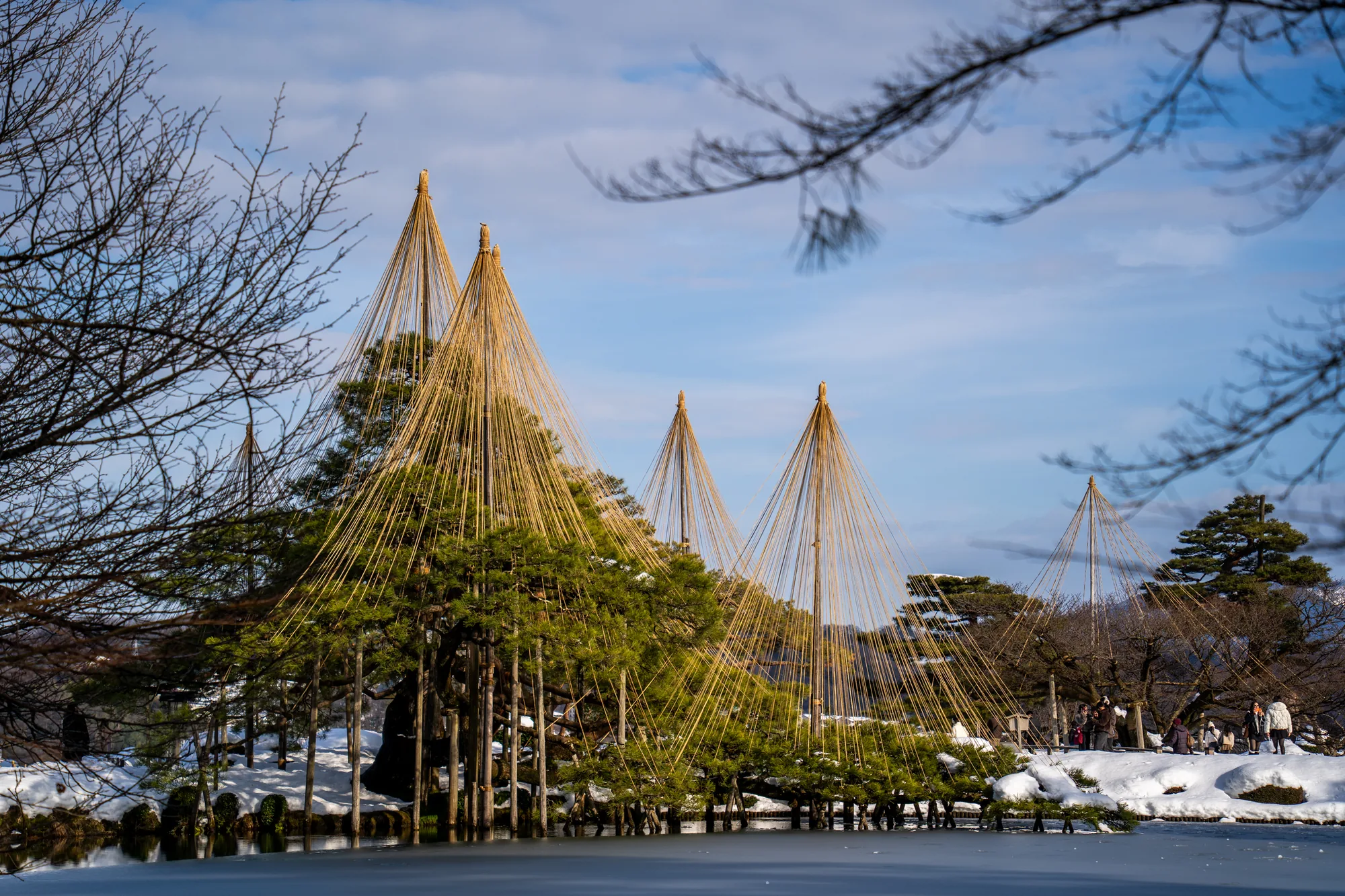 この写真は、金沢駅の有名な鼓門を内側から見上げた風景を捉えています。巨大なガラスドーム状の屋根は、複雑な鋼鉄の格子構造で覆われており、その隙間から青空が覗いています。構造全体は非常に近代的で、洗練された印象を与えます。屋根の下には、木造の鼓門の一部が見えており、伝統的な要素と現代的な構造が組み合わさった独特の景観を作り出しています。また、「消さないで きらきら光る 子どもの笑顔!」と書かれたオレンジリボンキャンペーンのバナーが吊り下げられています。これは児童虐待防止を訴えるものであり、社会的なメッセージが込められています。 写真の下部には、駅を利用する人々が歩いている様子が写っており、駅の活気ある雰囲気を伝えています。交通案内所の建物も見えます。全体的に、金沢駅のランドマークとしての鼓門の美しさと、駅の賑わいを捉えた写真と言えるでしょう。
